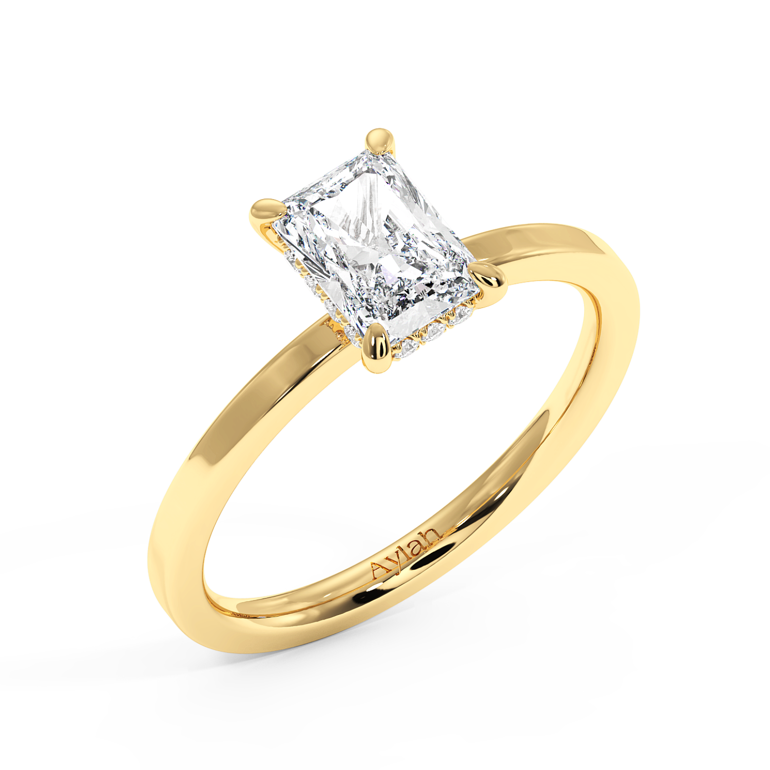 A hidden halo engagement ring offers a modern twist on a classic design, featuring a delicate circle of diamonds or gemstones tucked beneath the center stone. This subtle detail creates a captivating sparkle that is revealed when viewed from the side, adding intrigue and brilliance without overwhelming the centerpiece. The hidden halo enhances the appearance of the main stone, making it look larger and more radiant. Crafted in precious metals like platinum, white gold, or yellow gold, this style blends elegance with sophistication. A hidden halo engagement ring is perfect for those who love timeless beauty with a unique, romantic touch.